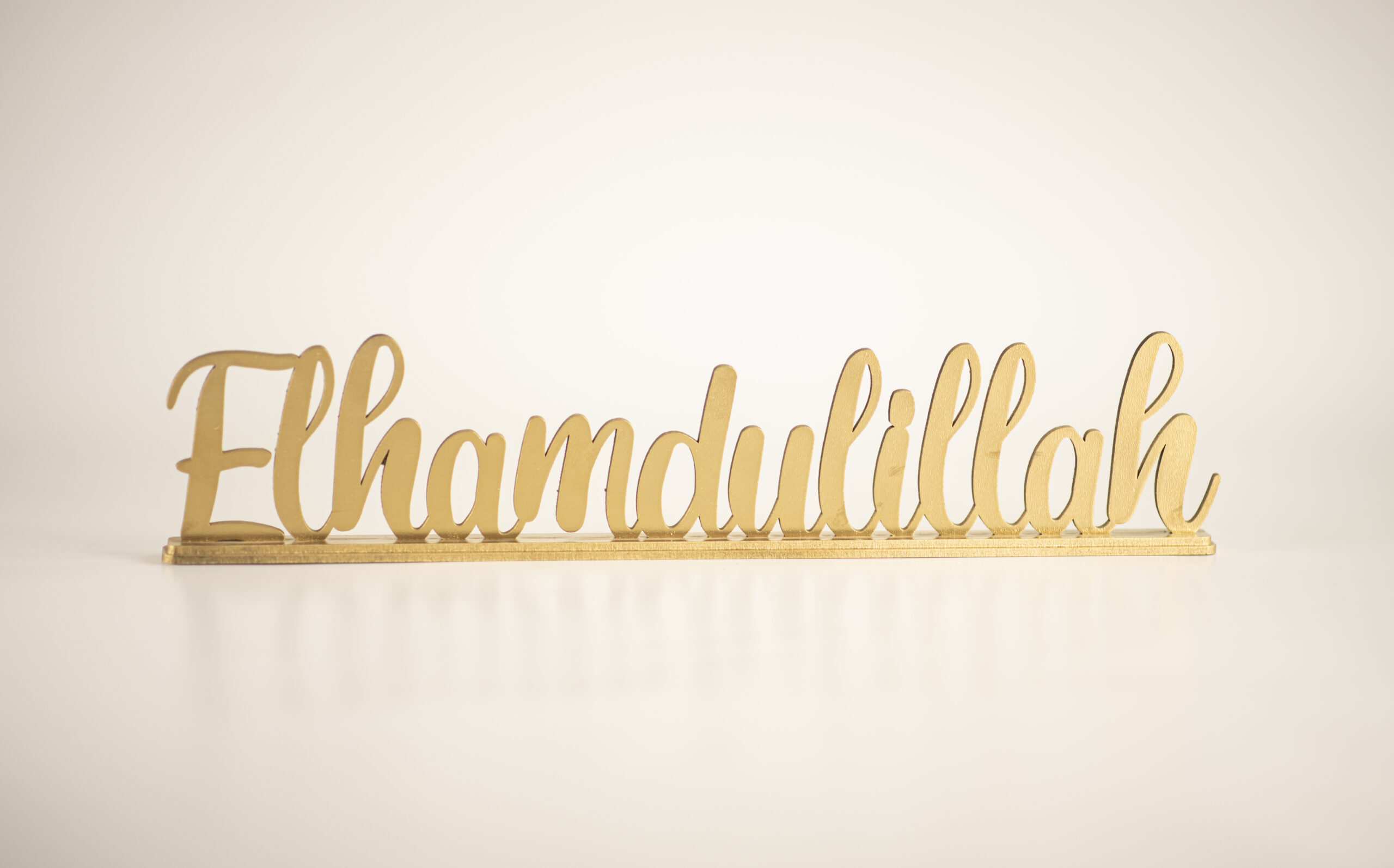 Stolna dekoracija sa natpisom Elhamdulillah, izrađena od dekorativnog drvenog materijala.